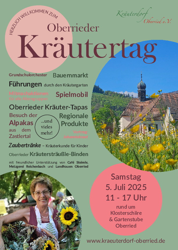 Jährlich organisiert der Verein Kräuterdorf Oberried einen großen Kräutertag mit vielen Marktständen rund um die Klosterschiire in Oberried. Von 11 bis 17 Uhr dreht sich dann alles um Kräuter, Kräuterprodukte und regionale Spezialitäten. Das umfangreiche Programm der Veranstaltung verspricht ein Fest für alle Sinne: Große und kleine Besucher können probieren, genießen, sich informieren und bei vielen Aktionen mitmachen. Besondere Erlebnisse sind vor allem die fachkundigen Führungen durch den prächtigen Oberrieder Kräutergarten und das Binden von duftenden Kräuterbüscheln oder die Kräuterkerzengestaltung